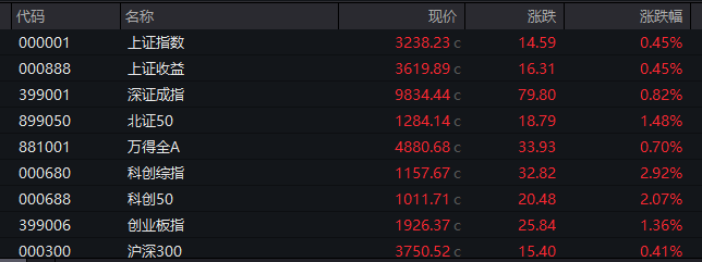 具體來(lái)看,A股主要股指午后全線(xiàn)走高,創(chuàng )業(yè)板指漲超1%,科創(chuàng )50指數漲約2%。截至收盤(pán),滬指漲0.45%報3238.23點(diǎn),深證成指漲0.82%報9834.44點(diǎn),創(chuàng )業(yè)板指漲1.36%報1926.37點(diǎn),科創(chuàng )50指數漲2.07%,北證50指數漲1.48%,滬深北三市合計成交13909億元,較昨日減少2685億元。