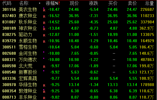 農業(yè)板塊盤(pán)中大幅下挫,截至收盤(pán),美農生物跌超18%,盤(pán)中一度逼近跌停;康農種業(yè)跌超16%,秋樂(lè )種業(yè)跌逾14%,金河生物、萬(wàn)向德農、北大荒、新賽股份(600540)等跌停。