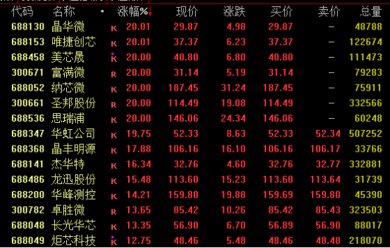半導體板塊今日大幅拉升,截至收盤(pán),晶華微、唯捷創(chuàng )芯、富滿(mǎn)微(300671)、納芯微、圣邦股份、思瑞浦等20%漲停,華虹公司漲19.75%。
