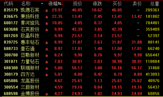 石英概念股盤(pán)中強勢上揚,截至收盤(pán),凱德石英30%漲停,石英股份、歐晶科技漲停,分別斬獲三連板和兩連板,惠豐鉆石、壹石通、岱勒新材(300700)等漲超8%。