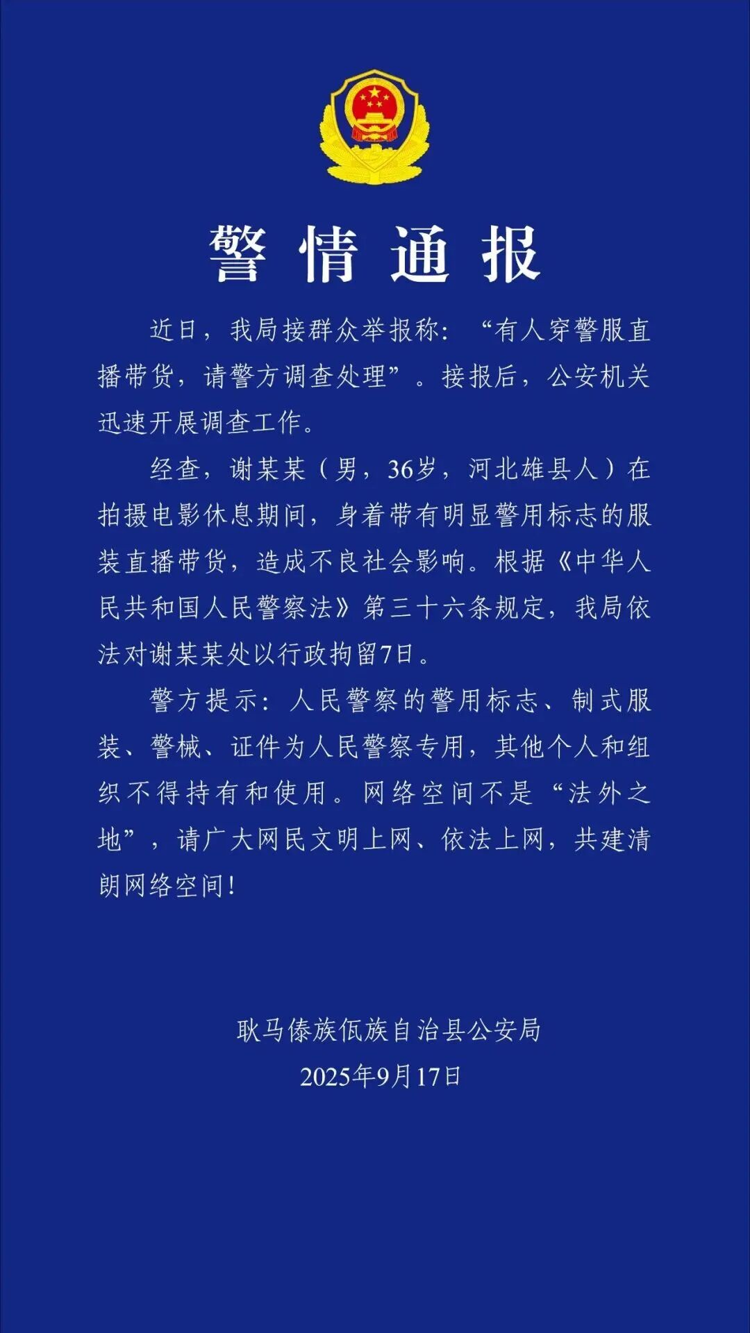 近日,“嘎子哥”謝孟偉因身著(zhù)警服直播帶貨,云南耿馬傣族佤族自治縣公安局依法對其處以行政拘留7日。