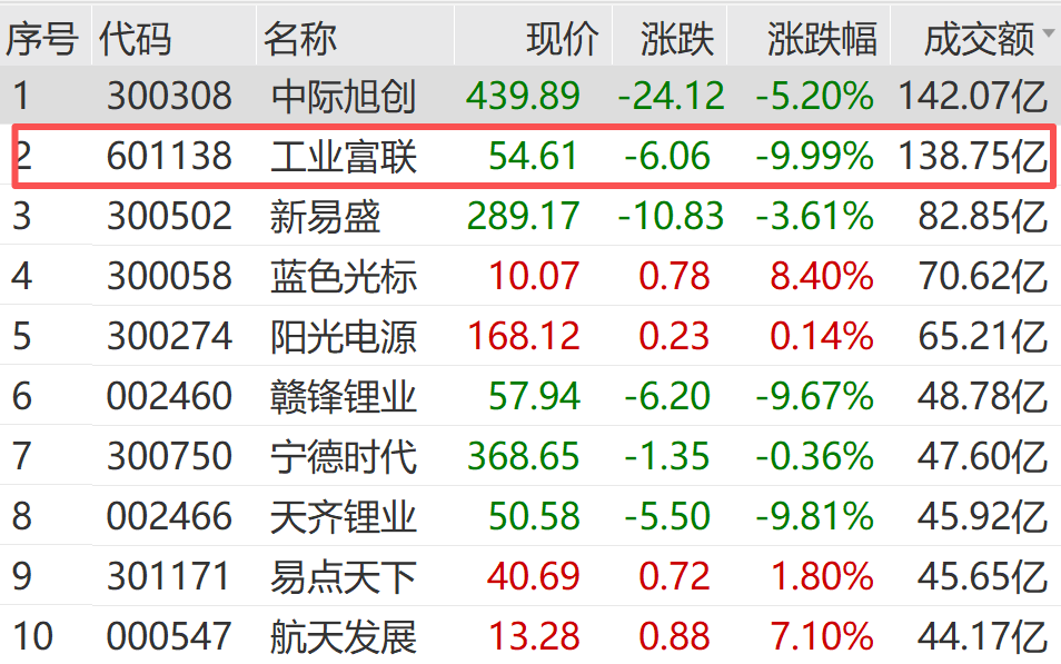 截至午間收盤(pán),工業(yè)富聯(lián)股價(jià)報54.61元/股,跌幅為9.99%,總市值為1.08萬(wàn)億元;半日成交額達138.75億元,居A股第二位。
