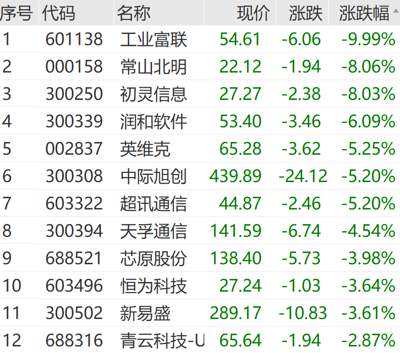 AI算力方向整體不振,常山北明(000158)、英維克(002837)、中際旭創(chuàng )(300308)、天孚通信(300394)、新易盛(300502)等普遍走低。