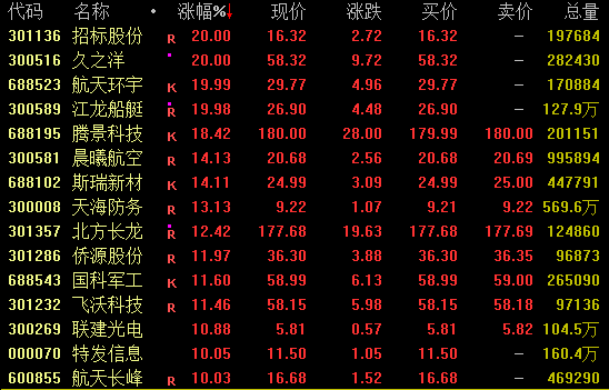 軍工板塊盤(pán)中大幅走高,衛星導航、商業(yè)航天概念等表現亮眼。截至收盤(pán),招標股份、久之洋、航天環(huán)宇、江龍船艇等20%漲停,北方長(cháng)龍(301357)漲超12%,中天火箭(003009)、長(cháng)城軍工(601606)亦漲停。