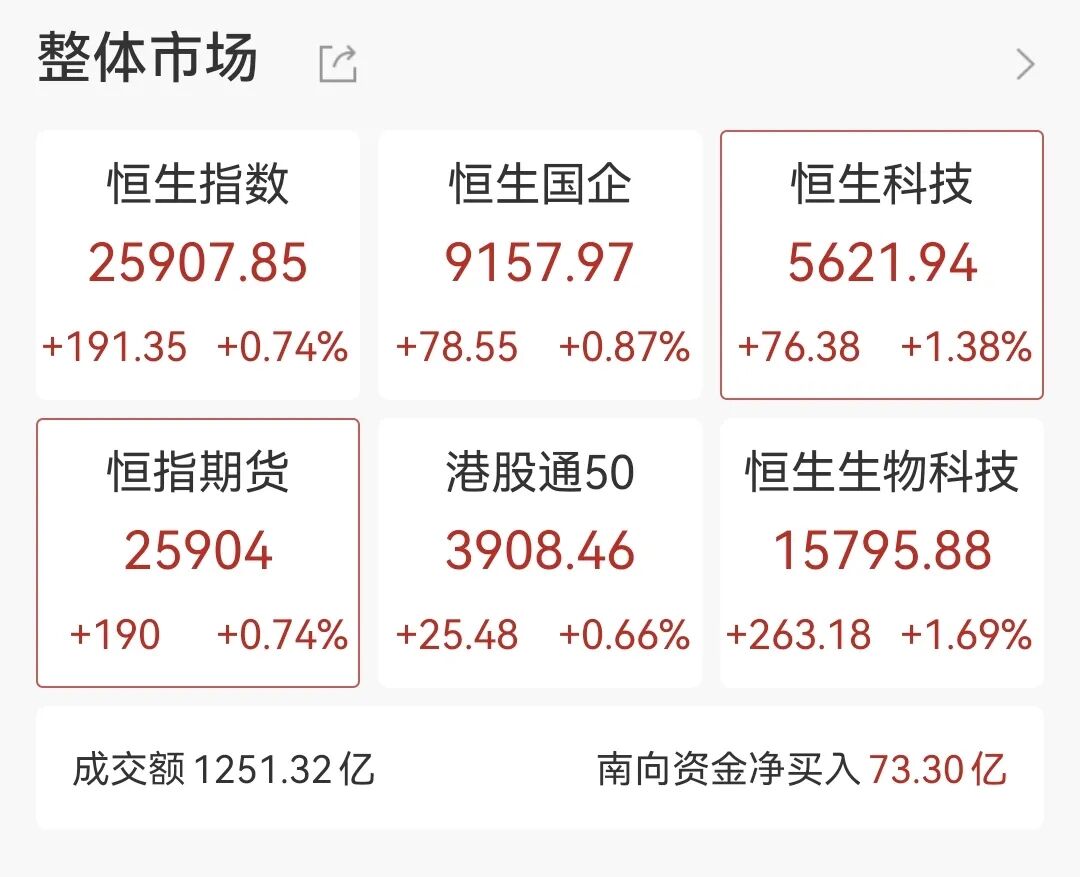 11月25日,港股三大指數同步上漲,截至發(fā)稿恒指0.74%,恒生科技指數漲1.38%,恒生國企指數漲0.87%。