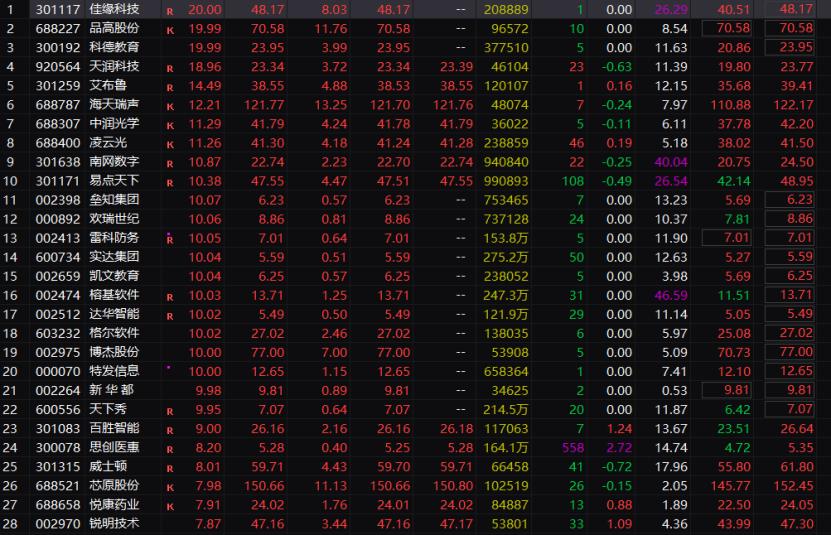 我們一起來(lái)看看,人工智能概念股今早的表現。佳緣科技(301117)、品高股份、科德教育(300192)皆20%漲停。漲停及漲幅超10%個(gè)股一度達到了22只。受此帶動(dòng),滬指漲幅擴大至1%,深證成指一度漲超2%,創(chuàng )業(yè)板指一度漲近3%,滬深北三市上漲個(gè)股近4800只。