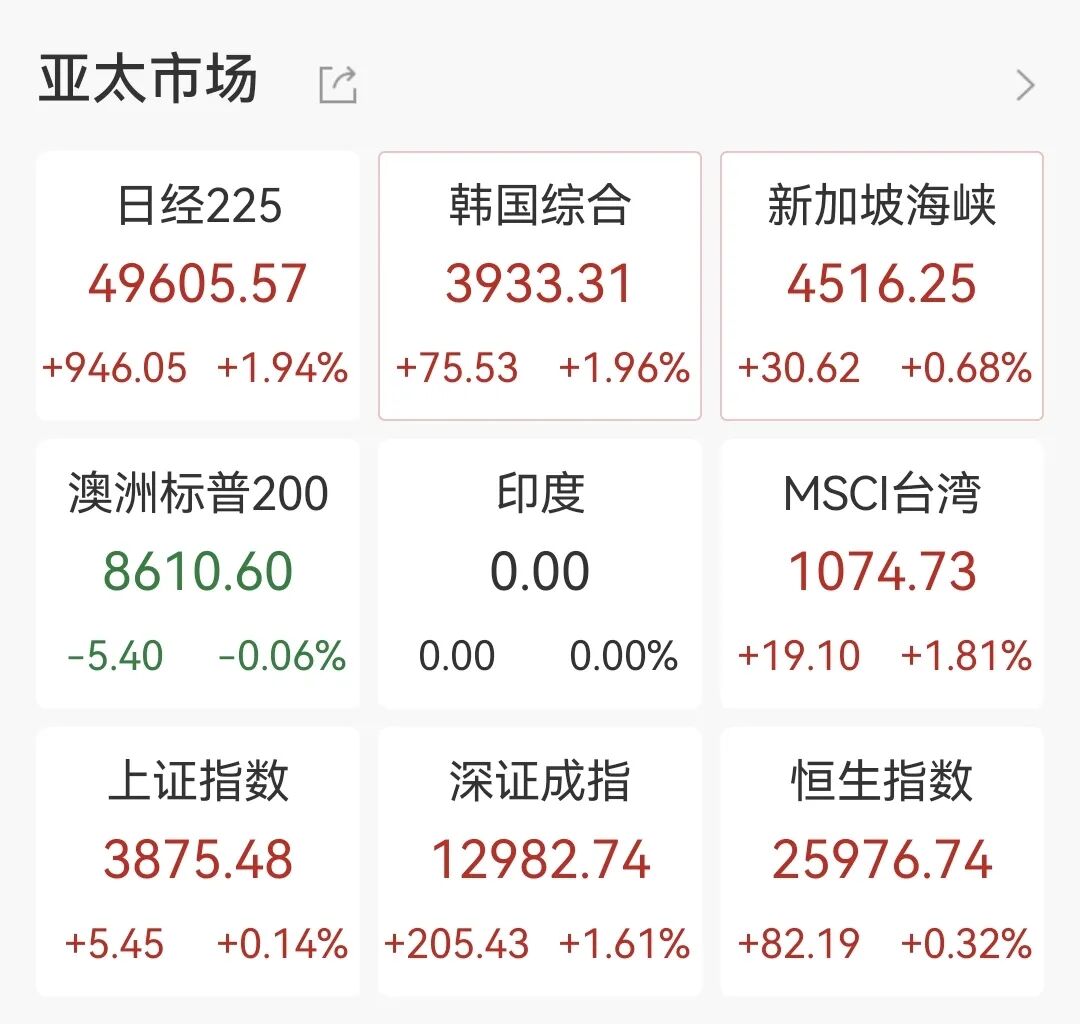 亞太股市方面,截至發(fā)稿,日經(jīng)225漲1.94%,軟銀集團反彈近7%,索尼、日立漲近3%;韓國綜合指數漲約1.96%,斗山能源漲約3.5%,三星電子、三星生物制劑漲超2%。港股方面,截至發(fā)稿,恒生指數、恒生科技指數恒生國企指數均漲0.32%,美團-W漲5.95%,中通快遞漲超4%,周大福跌6.43%。消息面上,周大福11月25日公布最新財報,在截至2025年9月30日六個(gè)月內,公司共實(shí)現營(yíng)業(yè)收入約389.86億港元,同比下降1.1%。