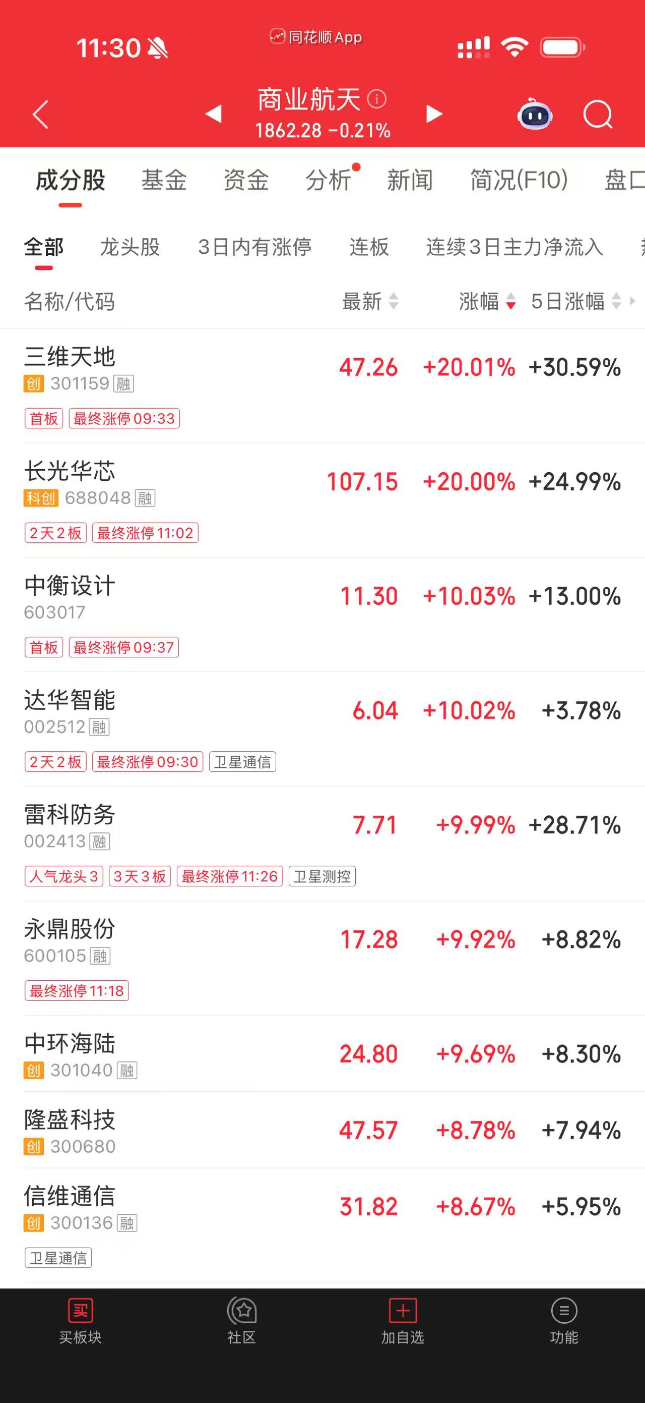 截至上午收盤(pán),三維天地(301159)(301159)、長(cháng)光華芯(688048)達成“20cm”漲停,中衡設計(603017)(603017)、達華智能(002512)(002512)、雷科防務(wù)(002413)(002413)、永鼎股份(600105)(600105)等多股漲停,中環(huán)海陸(301040)(301040)、乾照光電(300102)(300102)、信維通信(300136)(300136)、隆盛科技(300680)(300680)等個(gè)股漲超8%。