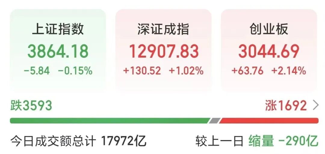 今日午后,A股三大指數走勢分化。截至收盤(pán),上證指數跌0.15%,深證成指漲1.02%,創(chuàng )業(yè)板指漲2.14%。市場(chǎng)全天成交額超1.79萬(wàn)億元。