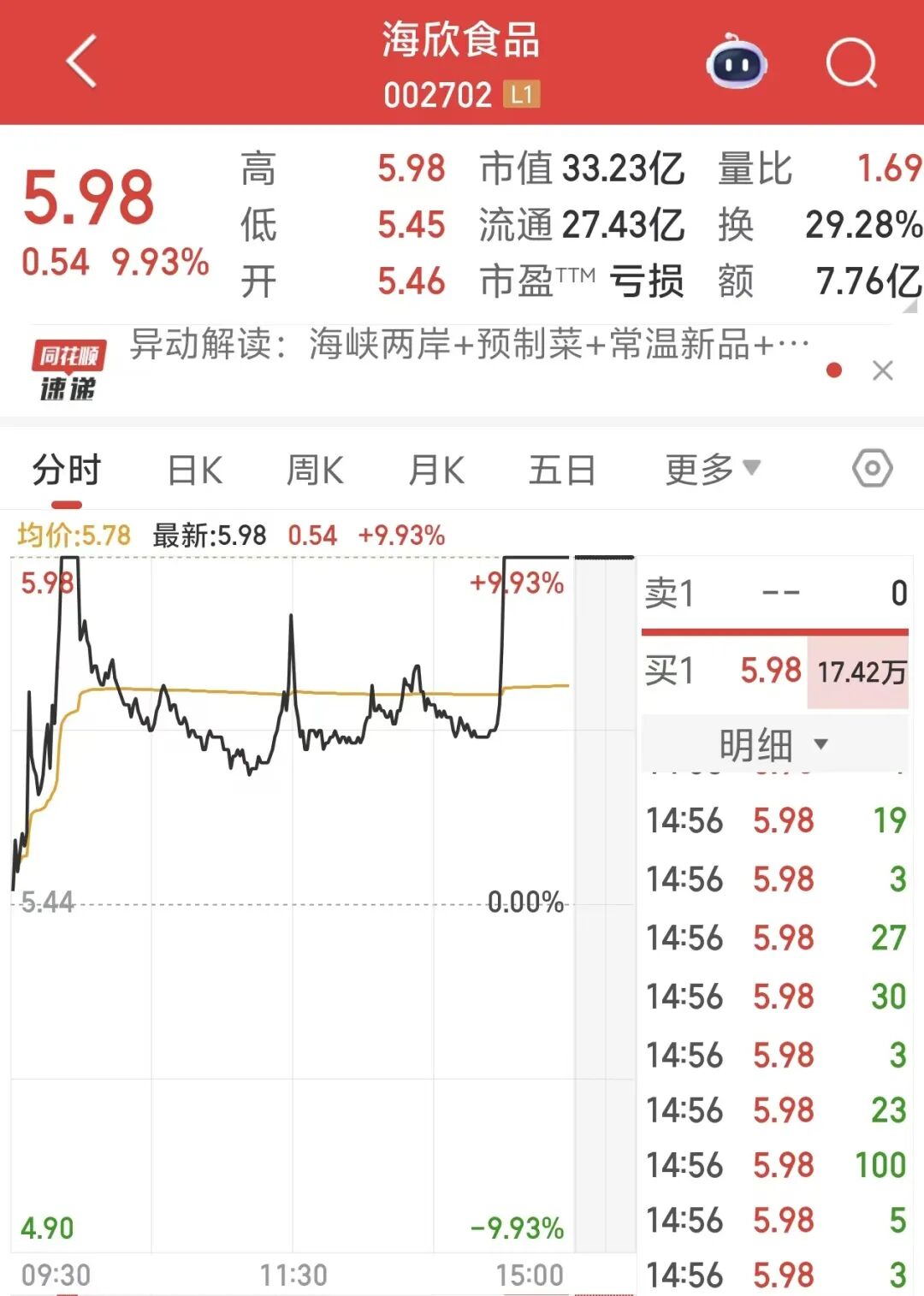 今日午后,大消費板塊尾盤(pán)異動(dòng)拉升。海欣食品直線(xiàn)上漲回封漲停,截至收盤(pán),封單超17萬(wàn)手;廣百股份(002187)、國光連鎖(605188)等多股漲停。