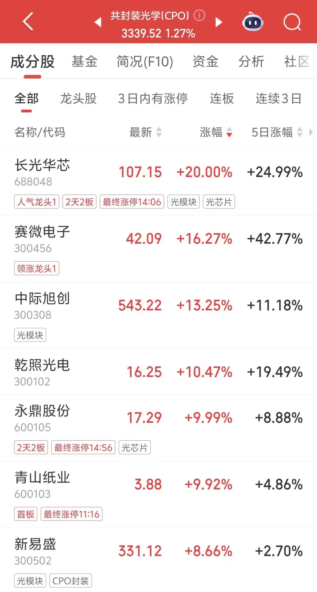 CPO(共封裝光學(xué))概念股午后持續走強,中際旭創(chuàng )(300308)盤(pán)中創(chuàng )歷史新高,永鼎股份(600105)漲停;抗流感概念股表現活躍,廣濟藥業(yè)(000952)3連板,北大醫藥(000788)2連板。房地產(chǎn)板塊沖高回落,中國武夷(000797)跌超6%,萬(wàn)科A跌超2%;軍工板塊回調,航天發(fā)展(000547)跌停。