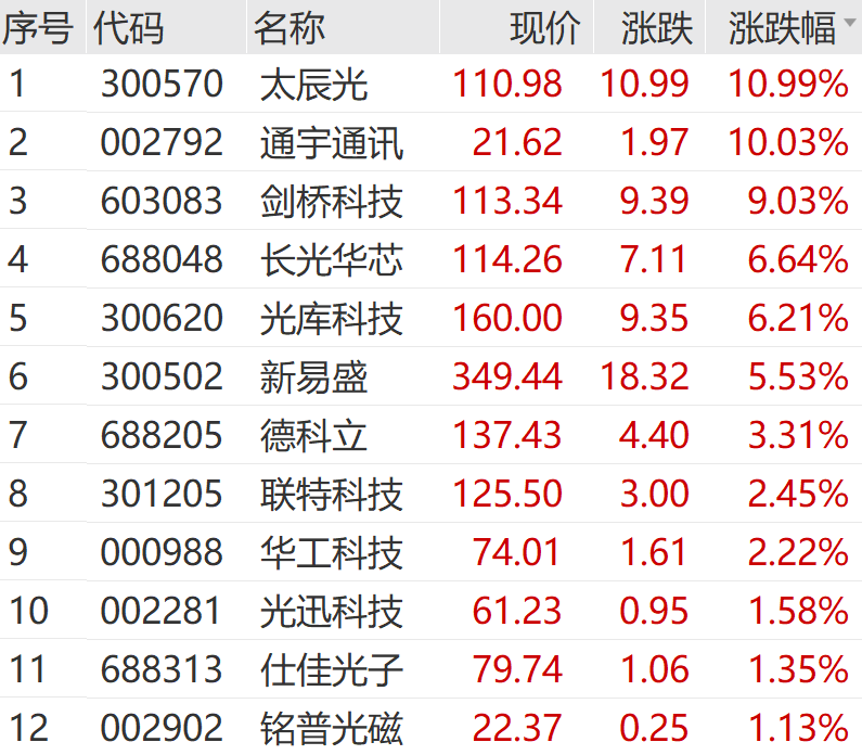 11月27日上午,光模塊概念股持續走強,通宇通訊(002792)漲停,劍橋科技(603083)盤(pán)中漲停后開(kāi)板,太辰光(300570)漲超10%。