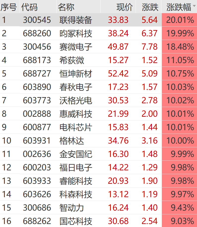 個(gè)股方面,聯(lián)得裝備(300545)、昀?萍20cm漲停,賽微電子(300456)20cm漲停后開(kāi)板;春秋電子(603890)、沃格光電(603773)、金安國紀(002636)等多股漲停。