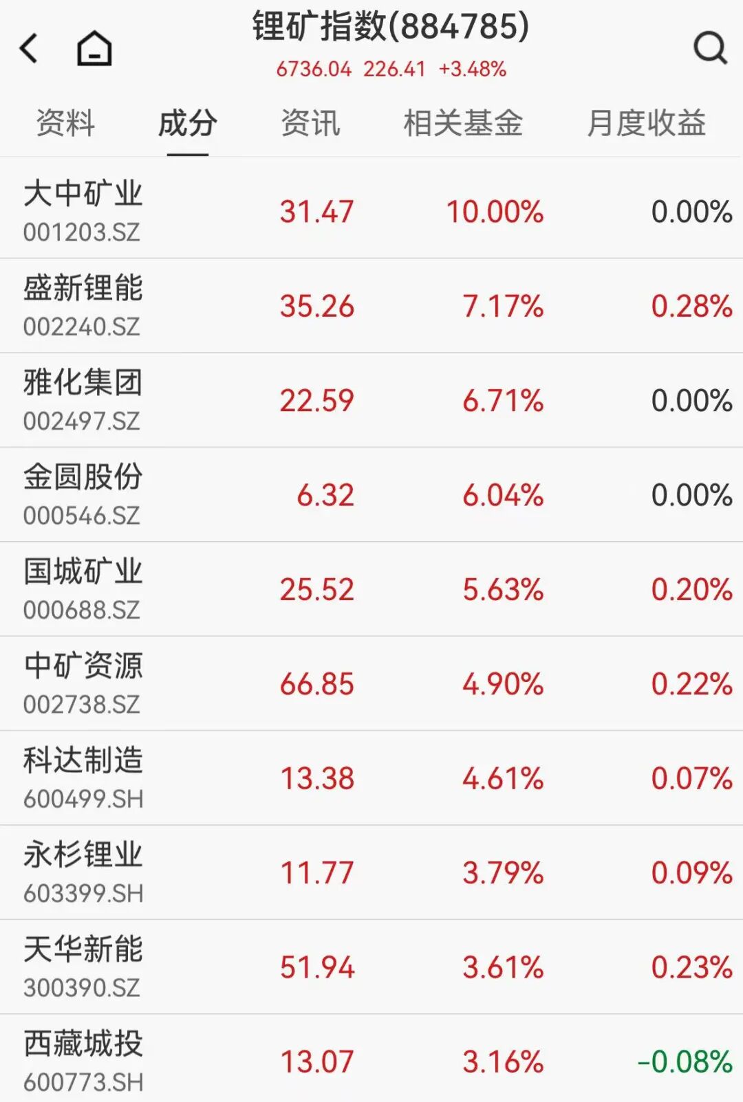 鋰礦股連續反彈,大中礦業(yè)(001203)強勢封板,盛新鋰能(002240)漲超7%,雅化集團(002497)漲超6%。