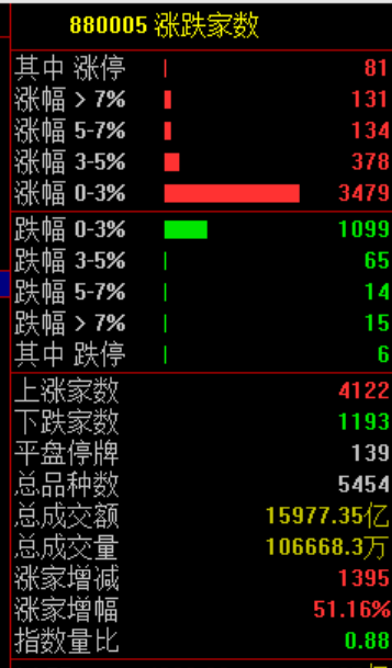 市場(chǎng)共4122只個(gè)股上漲,81只個(gè)股漲停,1193只個(gè)股下跌。