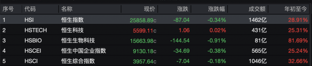 11月28日,恒生指數收跌0.34%,報25858.89點(diǎn);恒生科技指數收漲0.02%,報5599.11點(diǎn);恒生中國企業(yè)指數收跌0.38%,報9130.18點(diǎn)。全日大市成交額為1462億港元,南向資金凈買(mǎi)入27.27億港元。
