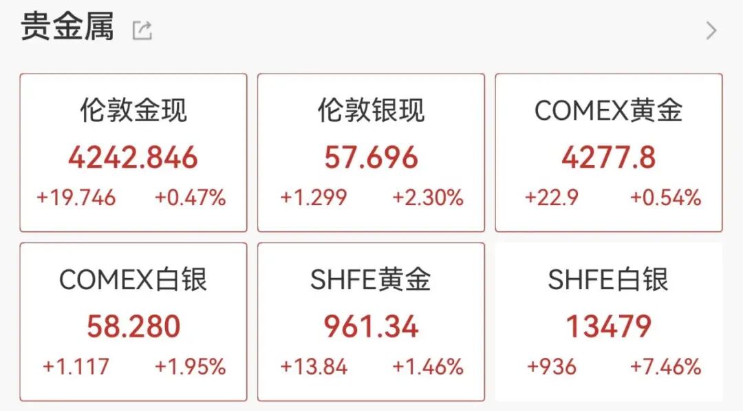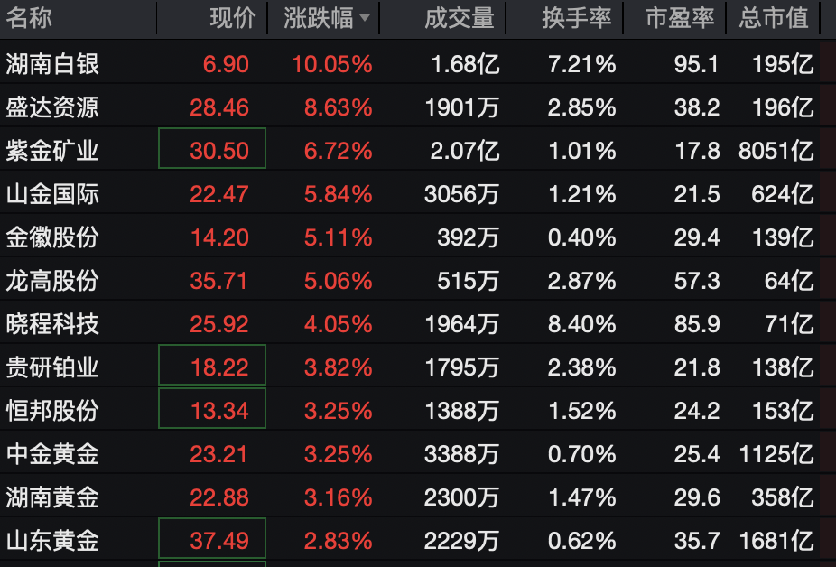 早盤(pán)貴金屬概念股拉升,湖南白銀(002716)漲停,盛達資源(000603)、紫金礦業(yè)(601899)、山金國際(000975)等跟漲。