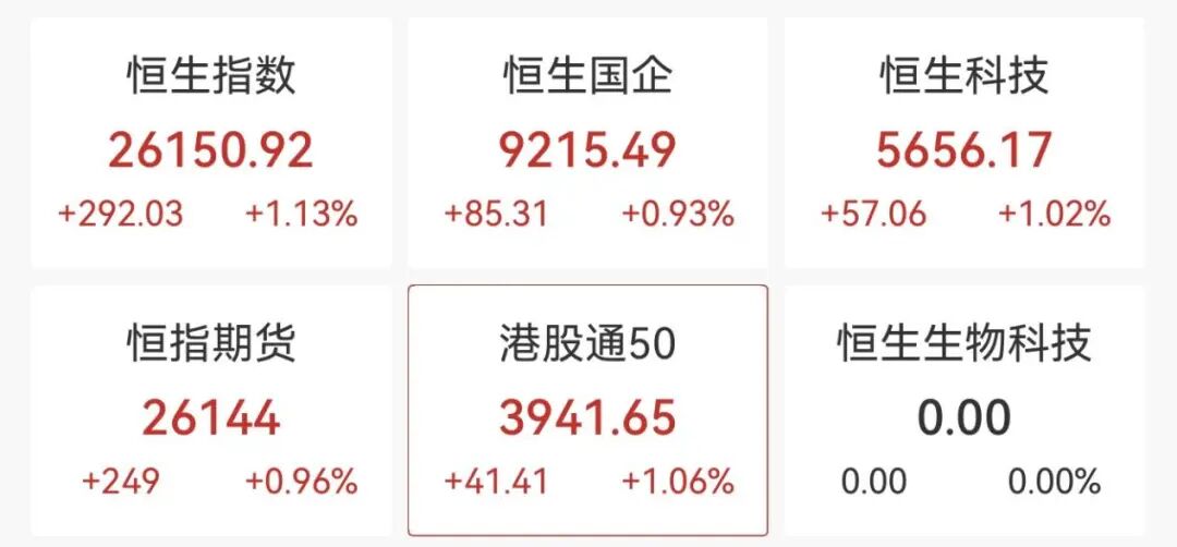 港股方面,恒生指數、恒生科技指數漲超1%,京東健康、阿里巴巴、同程旅行等漲超2%。