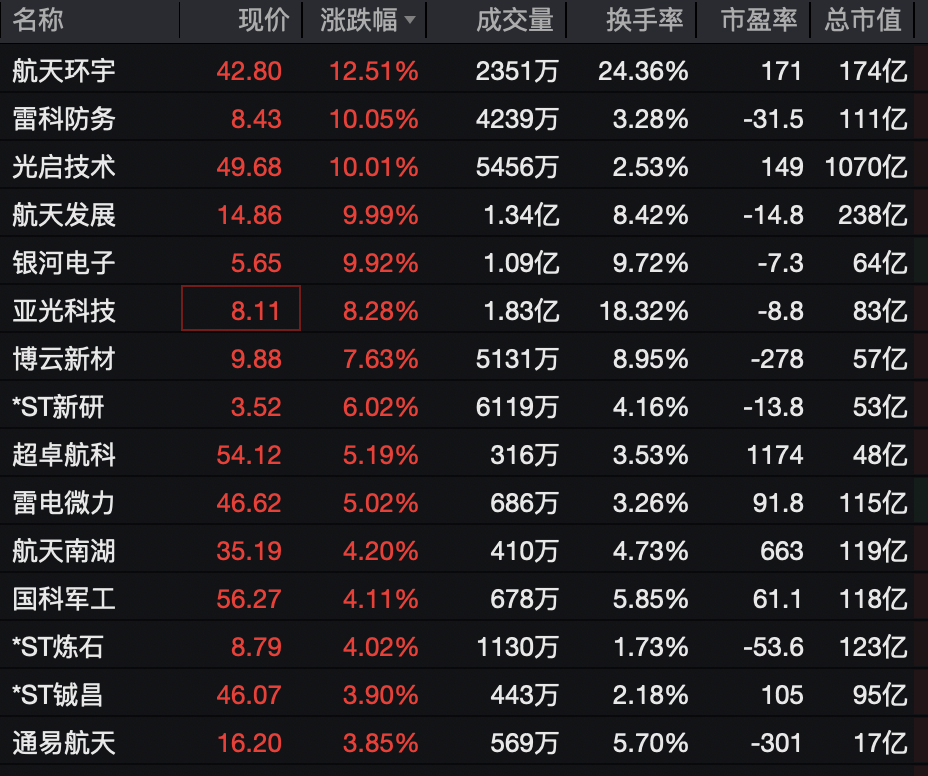 航天軍工板塊早盤(pán)走高,雷科防務(wù)(002413)、光啟技術(shù)(002625)、航天發(fā)展(000547)等多股漲停。