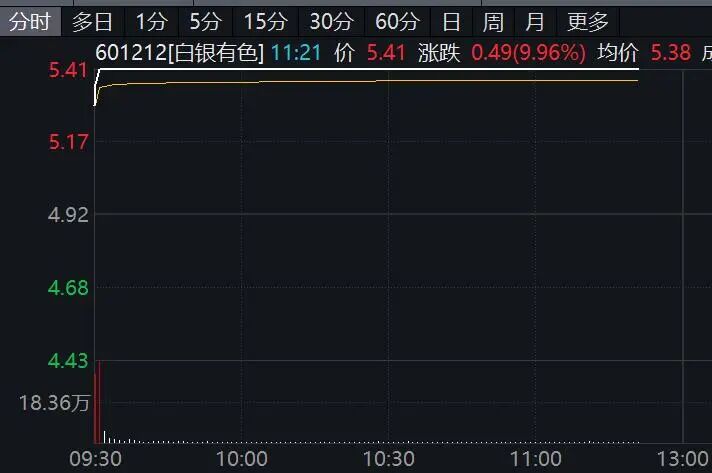 早間,有色金屬概念股全線(xiàn)走強,工業(yè)金屬板塊指數盤(pán)中一度放量大漲逾5%,開(kāi)盤(pán)不到1小時(shí)成交超前一交易日全天成交。白銀有色601212)僅約1分鐘就直線(xiàn)漲停,羅平鋅電002114)也僅約2分鐘垂直封板,閩發(fā)鋁業(yè)002578)、亞太科技002540)等均快速漲停。