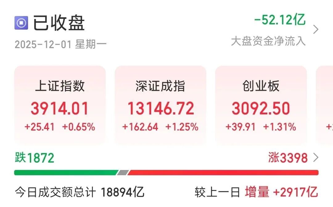 12月1日,A股三大指數集體上漲。截至收盤(pán),上證指數漲0.65%,重新站上3900點(diǎn);深證成指漲1.25%,創(chuàng )業(yè)板指漲1.31%,北證50漲1.52%。滬深京三市全天成交額為18894億元,較上一日增量2917億元。滬深兩市超3300只個(gè)股上漲。