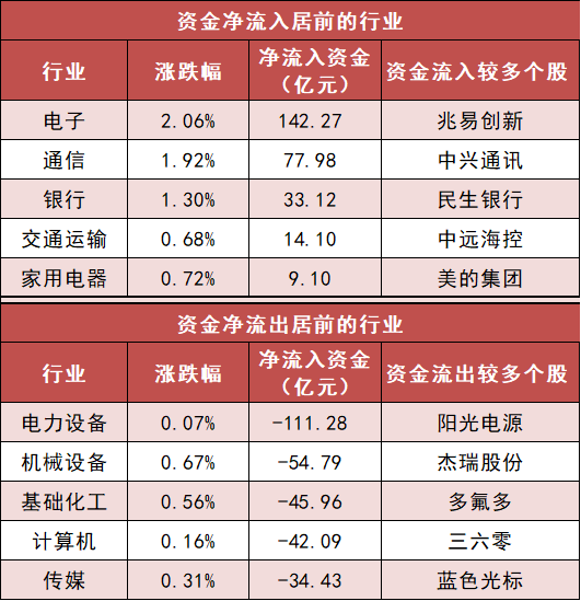 【1日資金路線(xiàn)圖】?jì)墒兄髁Y金凈流出超3億元 電子等行業(yè)實(shí)現凈流入