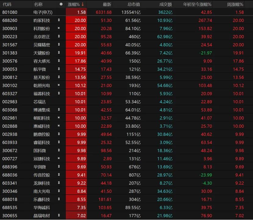 12只電子股漲停,昀?萍、科翔股份(300903)、北京君正(300223)、貝隆精密(301567)、天鍵股份(301383)“20cm”漲停,福蓉科技(603327)、芯瑞達(002983)、博通集成(603068)、朝陽(yáng)科技(002981)、惠威科技(002888)、鵬鼎控股(002938)、睿能科技(603933)漲停。