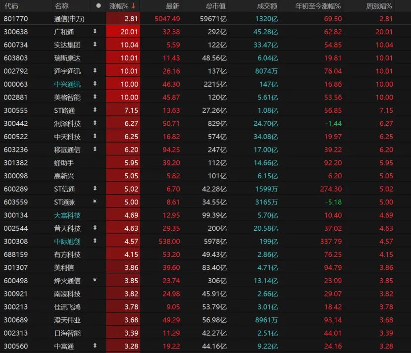 8只通信股漲停,廣和通(300638)“20cm”漲停,實(shí)達集團(600734)、瑞斯康達(603803)、通宇通訊(002792)、中興通訊、美格智能(002881)漲停。