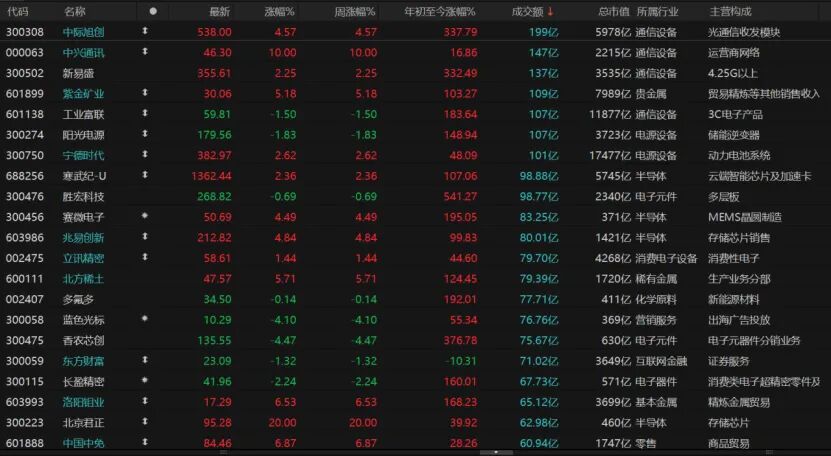 市場(chǎng)共計3398只個(gè)股收漲,漲停股76只;1872只個(gè)股收跌,跌停股7只。今日共有7只個(gè)股日成交額超過(guò)100億元,CPO概念龍頭股中際旭創(chuàng )(300308)收漲4.57%報538元/股,新易盛(300502)收漲2.25%報355.61元/股,中興通訊漲停,紫金礦業(yè)(601899)漲逾5%報30.06元/股。陽(yáng)光電源(300274)跌近2%,寧德時(shí)代(300750)漲近3%。