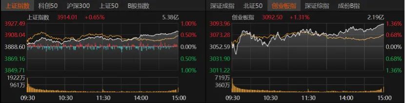 滬指收漲0.65%報3914.01點(diǎn),創(chuàng )業(yè)板指收漲1.31%報3092.5點(diǎn),深證成指收漲1.25%?苿(chuàng )50、滬深300、上證50漲約1%,北證50收漲1.52%。
