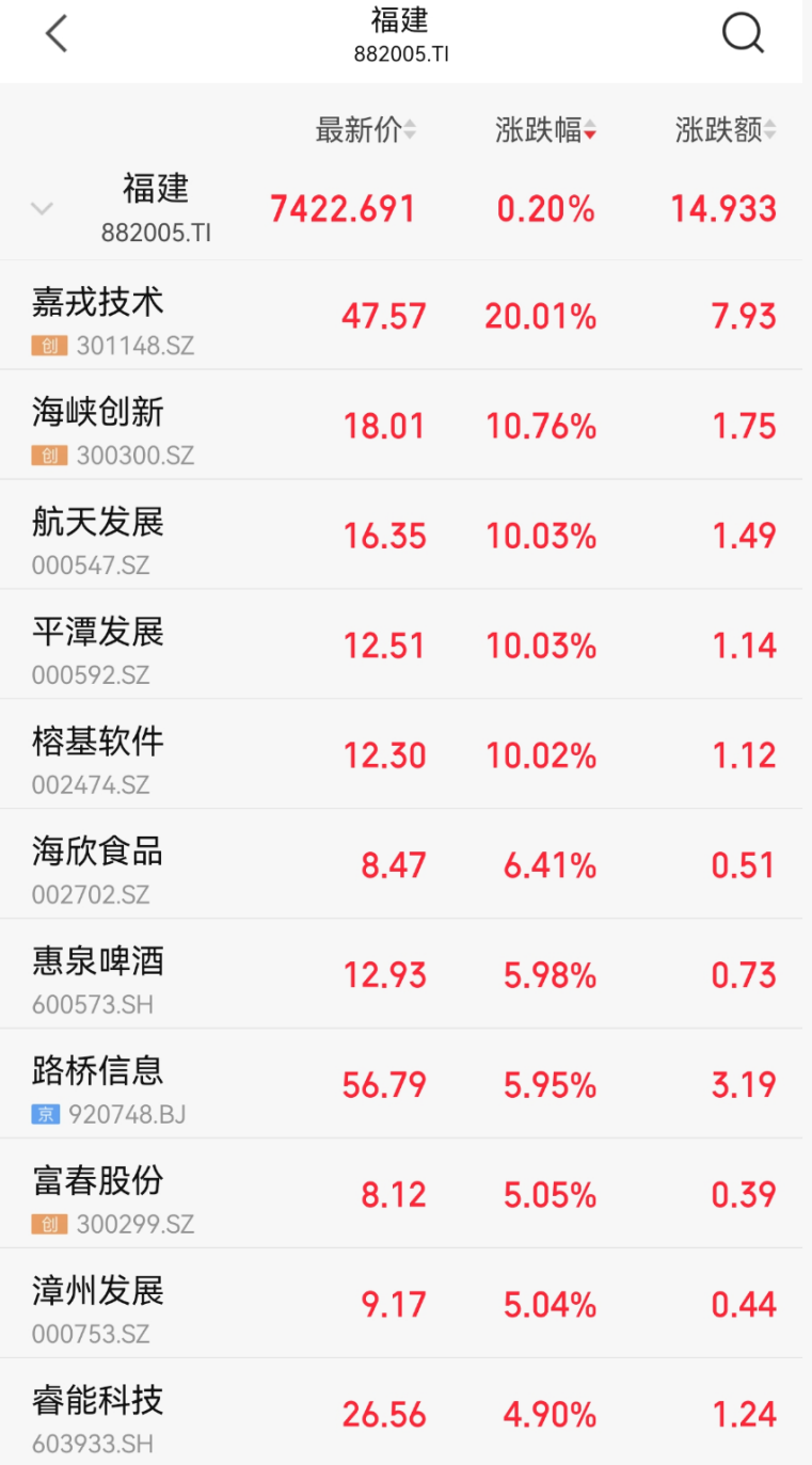 12月2日上午,福建本地股盤(pán)中拉升,嘉戎技術(shù)(301148)20cm漲停,航天發(fā)展(000547)、平潭發(fā)展(000592)、榕基軟件(002474)等集體漲停,海峽創(chuàng )新(300300)漲超10%。
