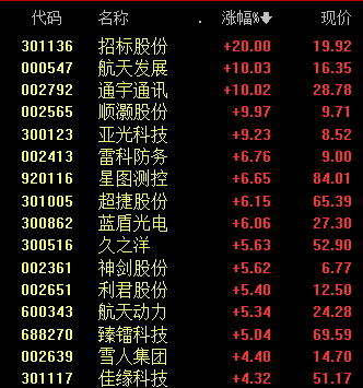 早盤(pán),商業(yè)航天概念異動(dòng)。順灝股份(002565)漲停,錄得3連板;招標股份(301136)(301136)3分鐘直線(xiàn)封板,漲幅達20%,航天發(fā)展(000547)、通宇通訊(002792)均收獲漲停;亞光科技(300123)、雷科防務(wù)(002413)、星圖測控等跟漲。