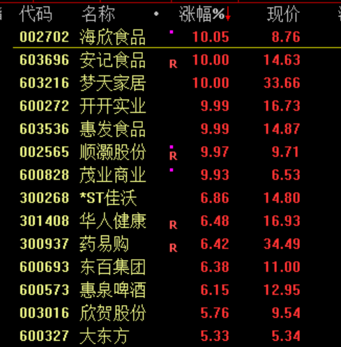 大消費板塊表現活躍,茂業(yè)商業(yè)(600828)、惠發(fā)食品(603536)等漲停。