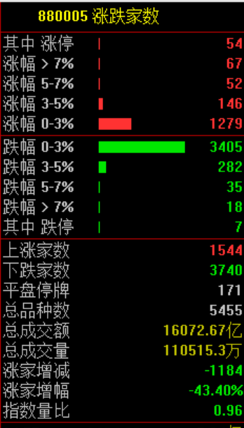 市場(chǎng)共1544只個(gè)股上漲,54只個(gè)股漲停,3740只個(gè)股下跌。