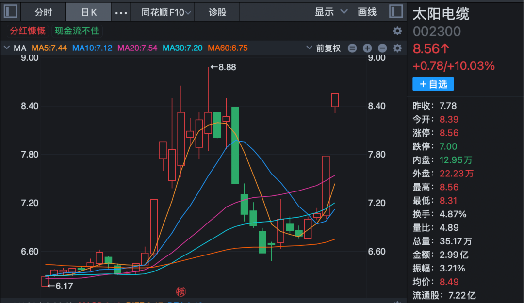 另外,福建板塊反復活躍。太陽(yáng)電纜(002300)漲停,走出2連板;閩東電力(000993)漲停;海通發(fā)展(603162)、實(shí)達集團(600734)、閩發(fā)鋁業(yè)(002578)、漳州發(fā)展(000753)、廈門(mén)港務(wù)(000905)、中國武夷(000797)跟漲。