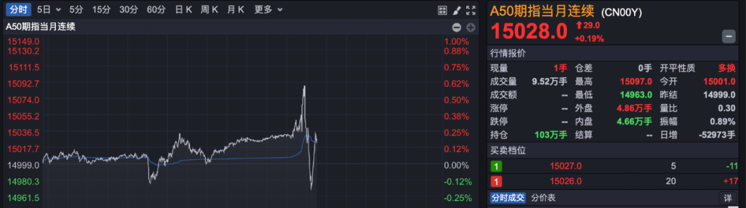A50期指盤(pán)中突然直線(xiàn)跳水,一度由漲轉跌,之后快速拉升,截至發(fā)稿漲幅為0.19%。