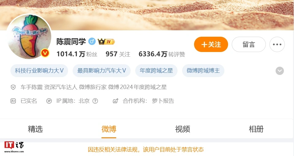 IT之家查詢(xún)多個(gè)社媒平臺發(fā)現,微博和抖音顯示陳震的社媒賬號 @陳震同學(xué) 因違反相關(guān)法律法規和政策,目前處于禁言狀態(tài);他的B站賬號 @蘿卜陳震同學(xué) 、小紅書(shū)賬號 @陳震同學(xué) 也處于封禁 / 禁言狀態(tài),其中小紅書(shū)的封禁理由是“違反相關(guān)社區規則”。