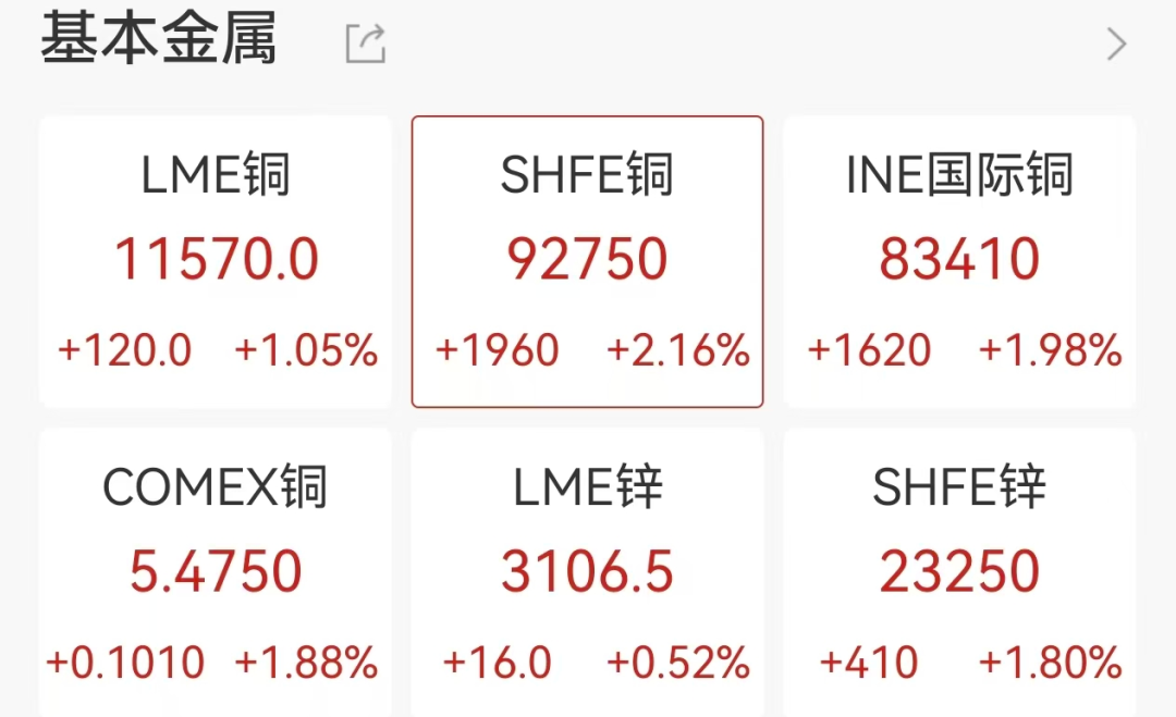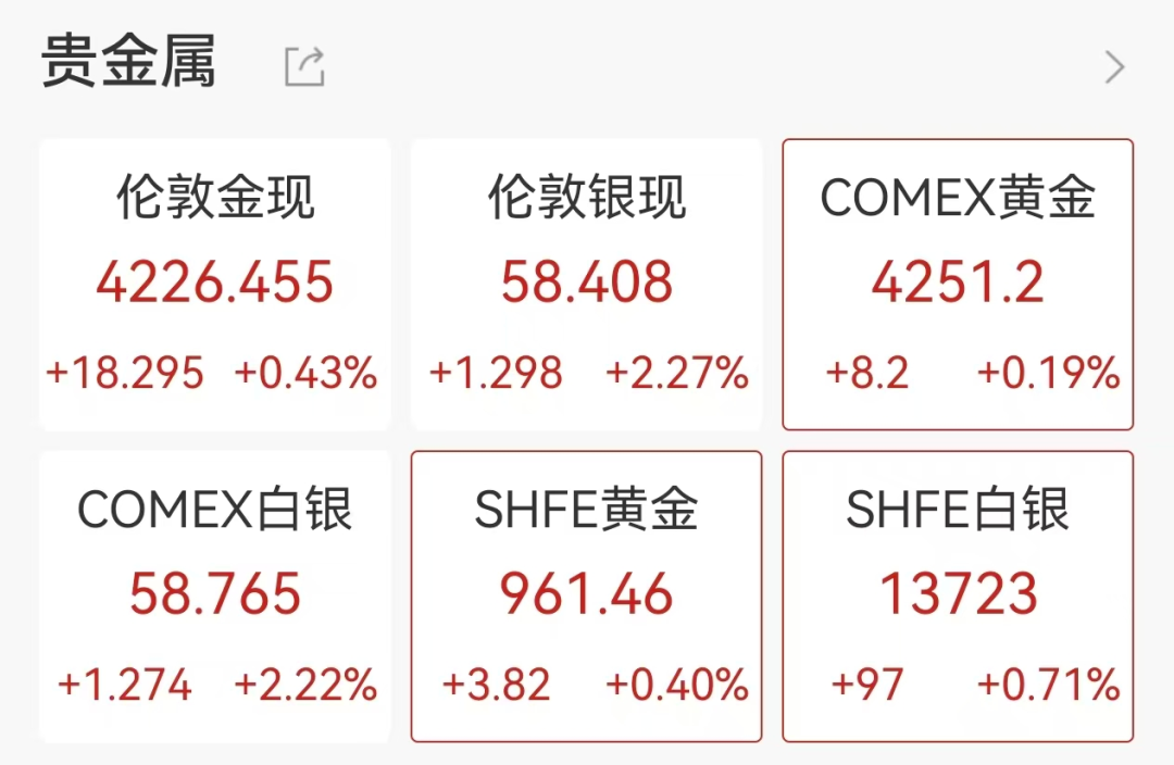 商品方面,LME倫銅漲幅擴大至約漲2%,紐約期銀日內漲幅擴大至2%,黃金現貨、期貨也有不同程度漲幅。