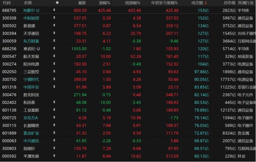 市場(chǎng)賺錢(qián)效應較好,共計4387只個(gè)股收漲,漲停股80只;975只個(gè)股收跌,跌停股12只。摩爾線(xiàn)程上市首日收漲425.46%報600.5元/股,總市值2823億元,日成交額153億元。光模塊通信概念“易中天”(新易盛(300502)、中際旭創(chuàng )(300308)和天孚通信(300394))日成交額均超過(guò)100億元,三股今日均收漲,其中天孚通信漲幅超過(guò)6%。券商股發(fā)力,東方財富(300059)收漲4.11%報23.31元/股,保險股中國平安漲近6%報61.99元/股。