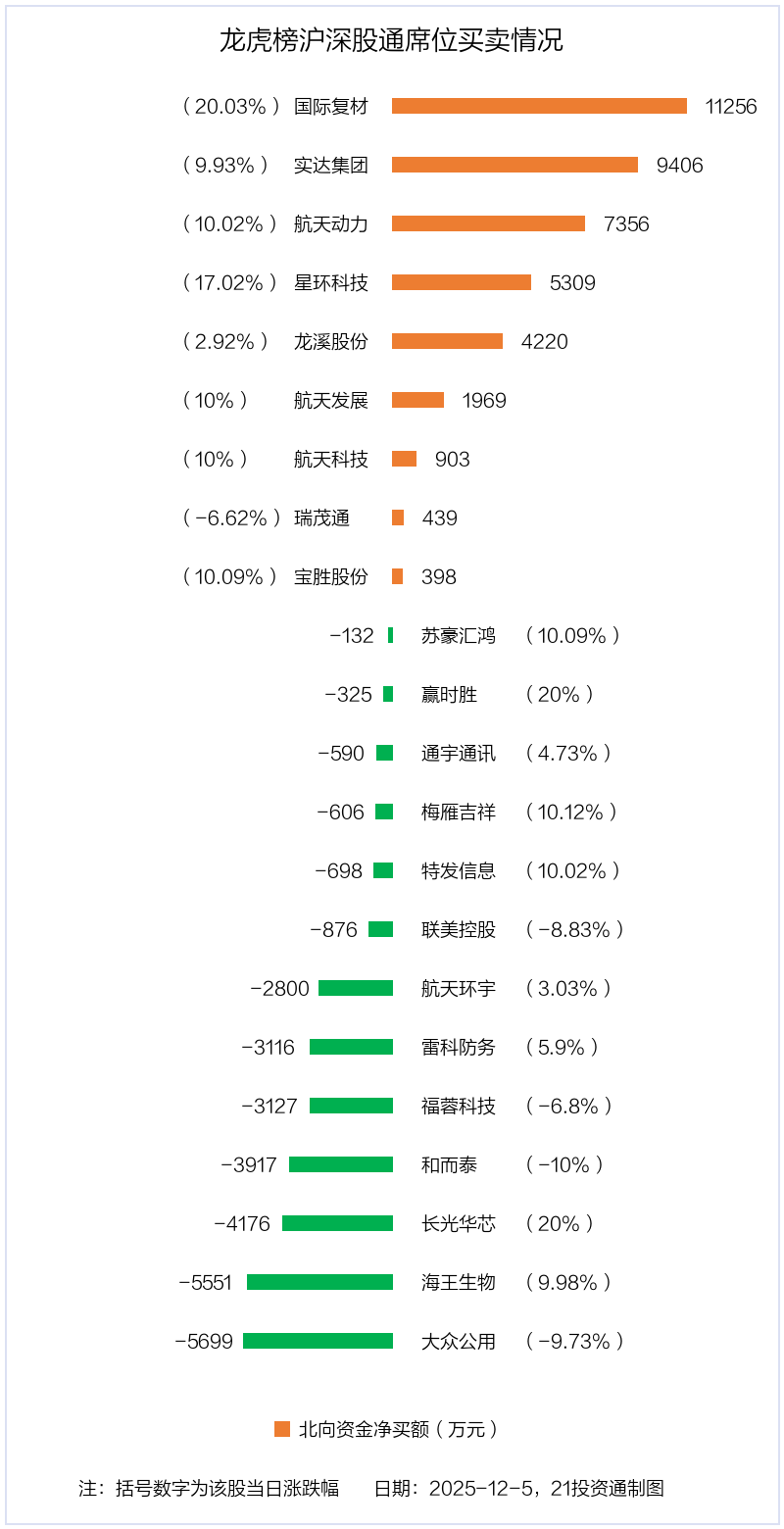 12月5日,北向資金參與龍虎榜中的個(gè)股共有22只,合計凈買(mǎi)入9641.04萬(wàn)元。其中滬股通凈買(mǎi)入6 股,凈賣(mài)出7 股,合計凈買(mǎi)入9712.25萬(wàn)元;深股通凈買(mǎi)入3 股,凈賣(mài)出6 股,合計凈賣(mài)出71.21萬(wàn)元。