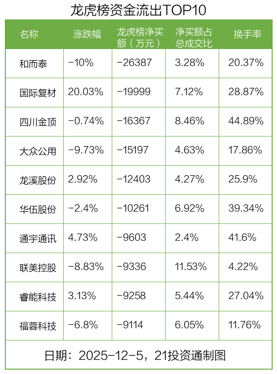 而龍虎榜中資金凈流出最多的是和而泰(002402)(002402.SZ),被凈賣(mài)出為2.64億元,占總成交金額的3.28%。和而泰收盤(pán)下跌10%,換手率為20.37%。