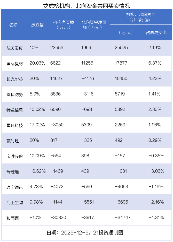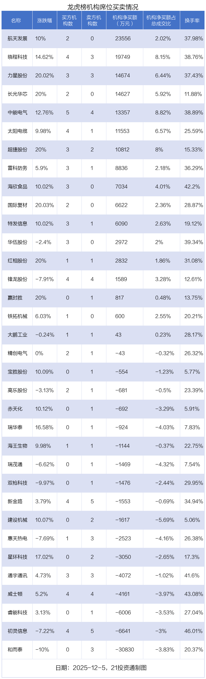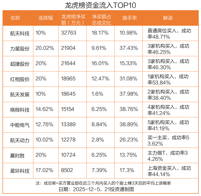 12月5日,上證指數上漲0.7%,深證成指上漲1.08%,創(chuàng )業(yè)板指上漲1.36%。盤(pán)后龍虎榜數據顯示,共有49只個(gè)股因當日異動(dòng)登上龍虎榜,資金凈流入最多的是航天科技(000901)(000901.SZ),達3.28億元。