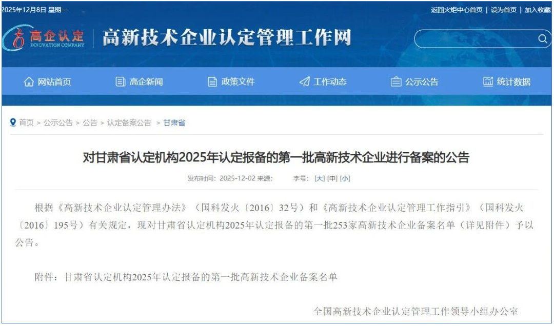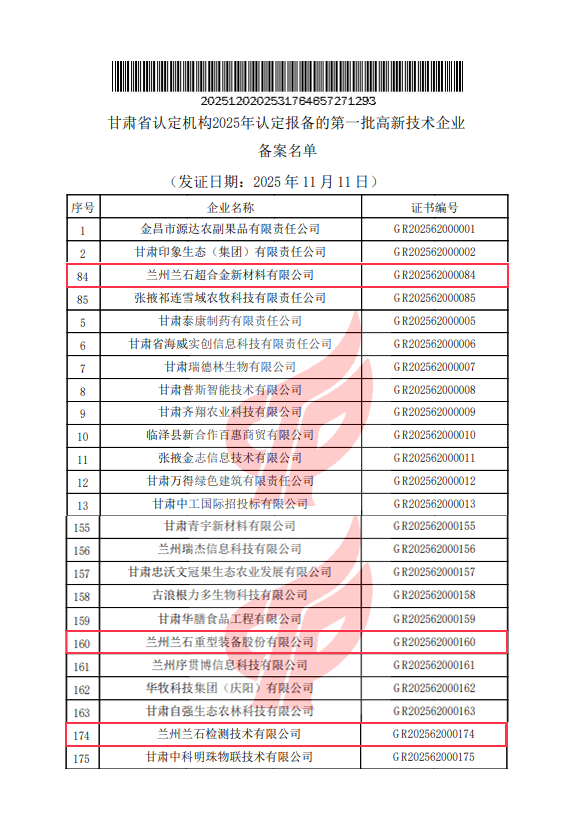 近日,全國高新技術(shù)企業(yè)認定管理工作領(lǐng)導小組辦公室公布甘肅省認定機構2025年認定報備的第一批253家高新技術(shù)企業(yè)備案名單,蘭石重裝(603169)及子公司檢測公司順利通過(guò)高新技術(shù)企業(yè)復審,子公司超合金公司首次獲得高新技術(shù)企業(yè)認定。
