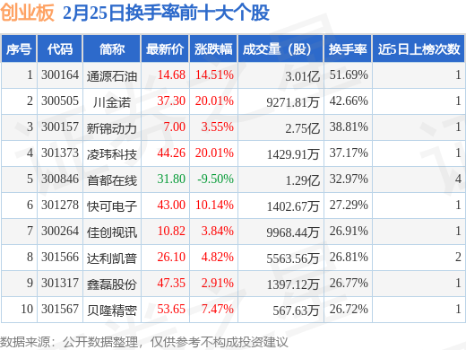 2月25日創(chuàng)業(yè)板換手率前十大個(gè)股,通源石油居首