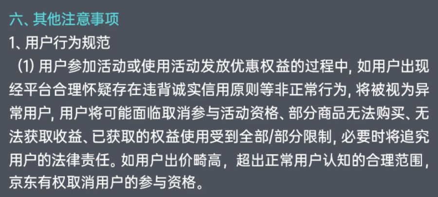 競價(jià)成功的用戶(hù)會(huì )收到短信支付提醒,一小時(shí)內仍未提交訂單的用戶(hù)將收到電話(huà)支付提醒。用戶(hù)需要在競價(jià)成功后24小時(shí)內提交訂單,并在30分鐘內支付貨款,若逾期未提單或逾期未支付,訂單將被取消。若用戶(hù)出價(jià)畸高,“超出正常用戶(hù)認知的合理范圍”,京東有權取消用戶(hù)的參與資格。