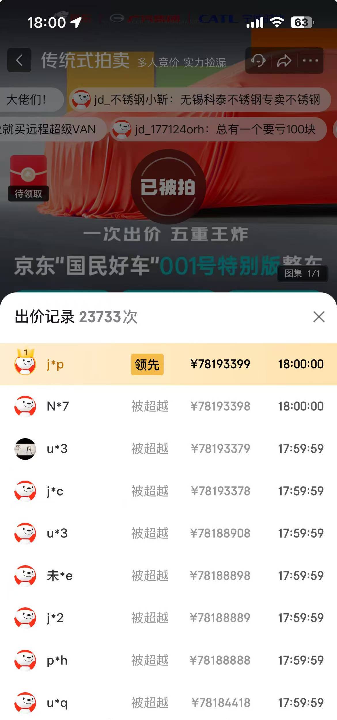 1元起拍,最終價(jià)超7800萬(wàn)!京東“國民好車(chē)”001號特別版拍賣(mài)結束