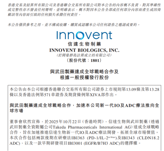 10月22日,信達生物宣布與武田制藥達成重磅全球戰略合作,共同加速推進(jìn)信達生物新一代IO與ADC療法的全球開(kāi)發(fā),打造顛覆性癌癥治療方案,造福全球患者。