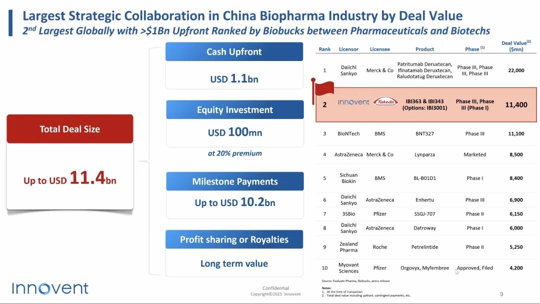 信達生物制作了一張PPT,呈現全球前十大創(chuàng )新藥交易。在這張PPT中,此次114億美元的總交易額僅次于第一三共2023年一筆220億美元的交易。