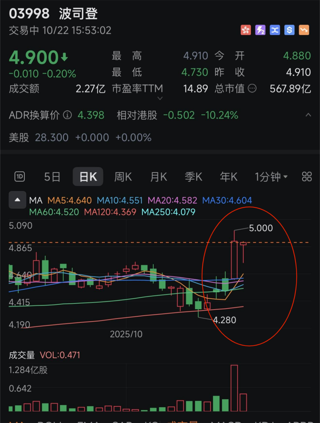 昨日(10月21日),波司登股價(jià)大漲近9%,報4.91港元,創(chuàng )下近期新高。