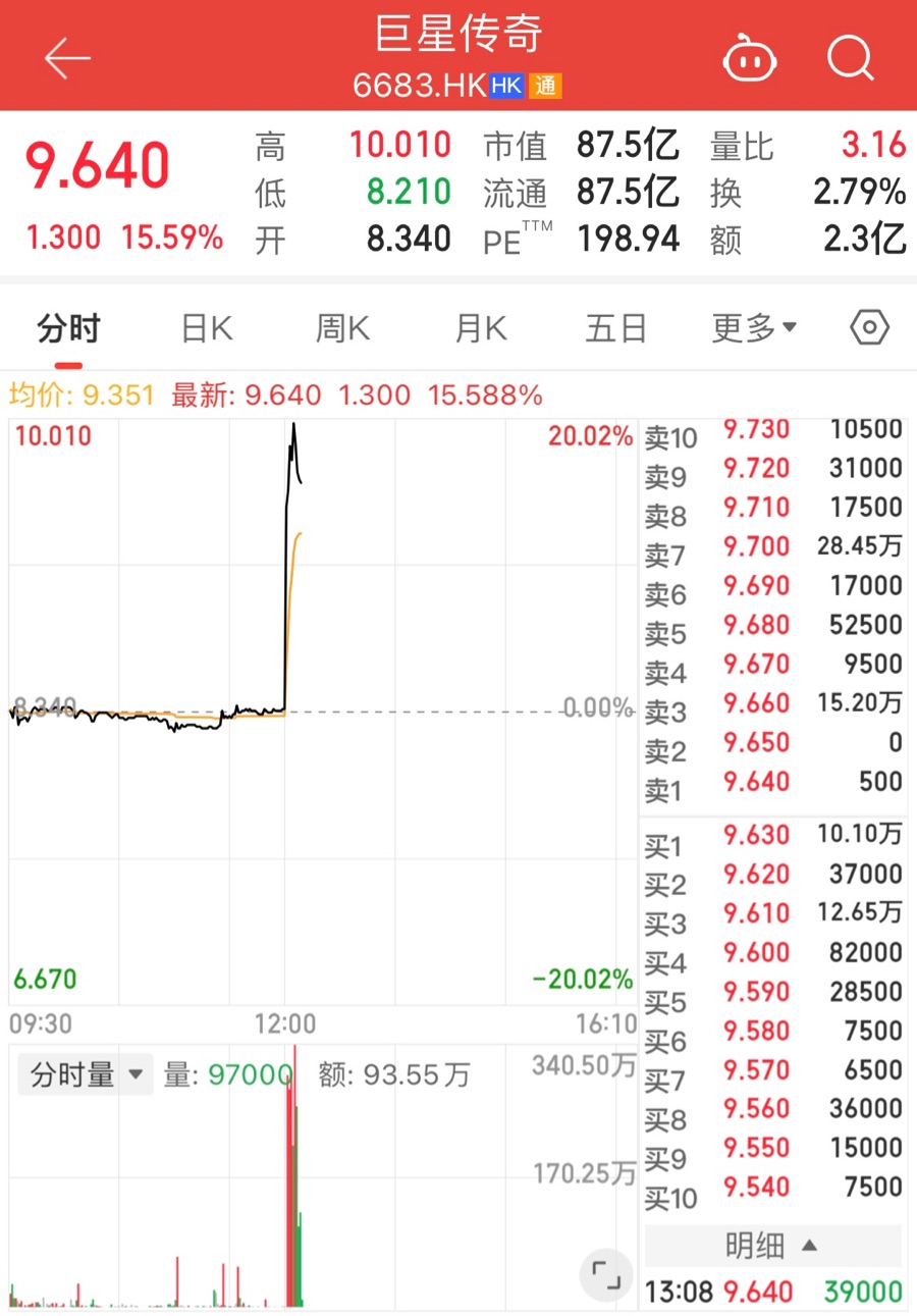 11月12日,港股“周杰倫概念股”巨星傳奇(06683.HK)午后股價(jià)直線(xiàn)拉升,盤(pán)中一度漲超20%,截至13時(shí)08分,報9.64元/股,漲幅為15.59%。這波強勢上漲源自公司午間的一紙公告,公司與機器人公司宇樹(shù)科技成立合資企業(yè),共同開(kāi)發(fā)消費級IP機器人。